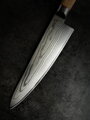 Nůž šéfkuchaře se stal v západních zemích nejoblíbenějším a nejpoužívanějším tvarem nože pro amatérské i profesionální kuchyně. 67 vrstev Japonské damaškové oceli s vysokým obsahem karbonu AUS-10V zajišťuje dlouhotrvající tvrdost, korozivzdornost a nevídanou sílu v jakémkoliv řezu. S rukojetí olivového dřeva která je chráněná proti jakémukoliv vstřebávání chuti nebo zápachu potom tvoří dokonale vyvážený nůž. Krájení, sekání, drcení ani porcování vám nebude dělat s tímto nožem jakékoliv problémy. Díky výše položenému hrotu a tím pádem zakřivenému ostří je vhodný i na kolébkové sekání například bylinek nebo zeleniny. Ruční dobrušování spolu s ručním leštěním zaručuje jak dlouhotrvající přesnost ostří, tak krásný lesk.